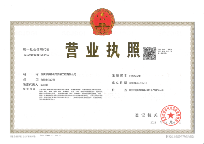 重慶思敏特機(jī)電安裝工程有限公司地址:重慶市南岸區(qū)雙峰山路2號(hào) 聯(lián)系電話:023-62510213